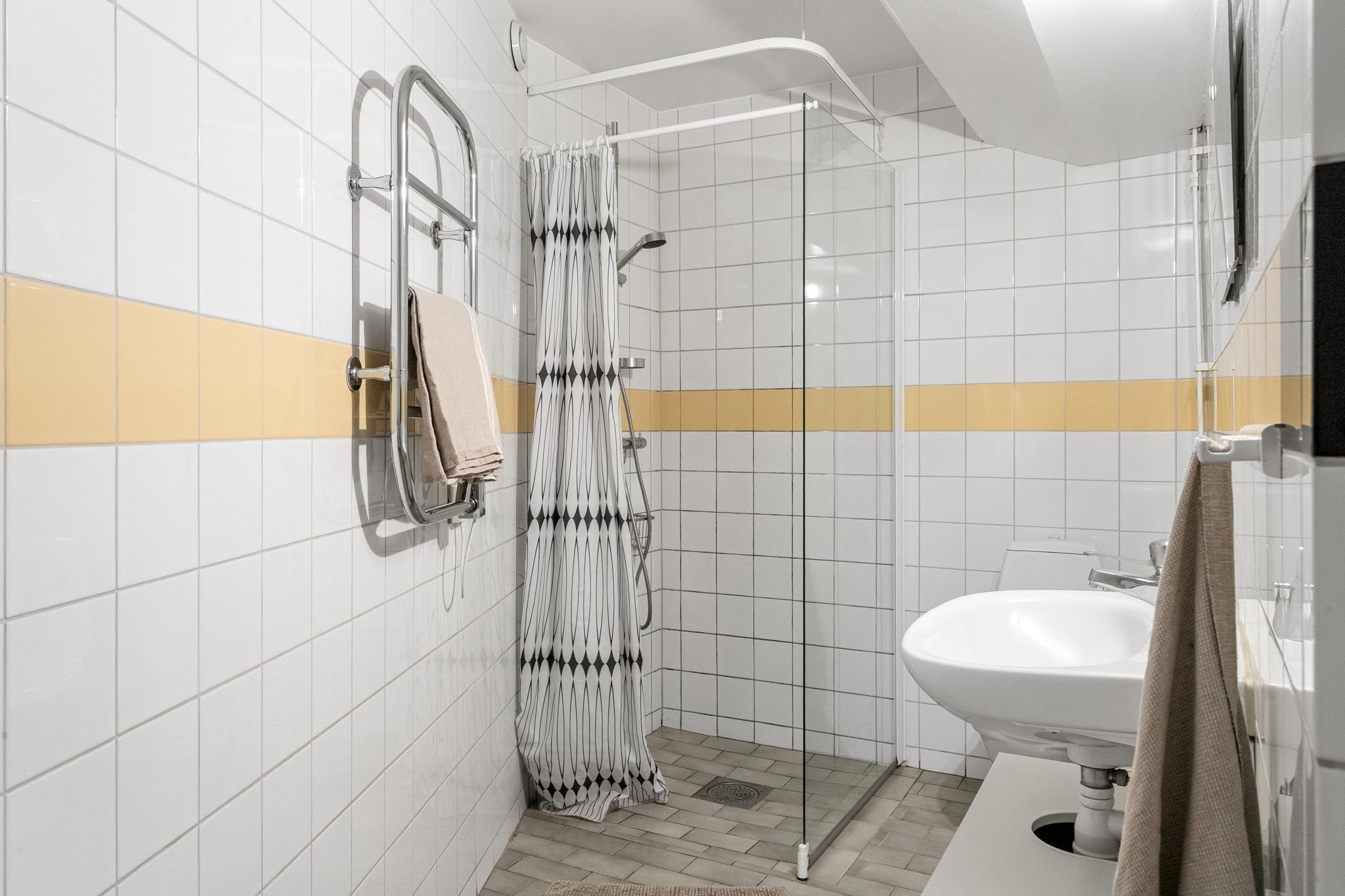 Direkt till vänster innanför entrén ligger det helkaklade badrummet. Här finns, dusch, wc, handfat med skåp samt handdukstork.