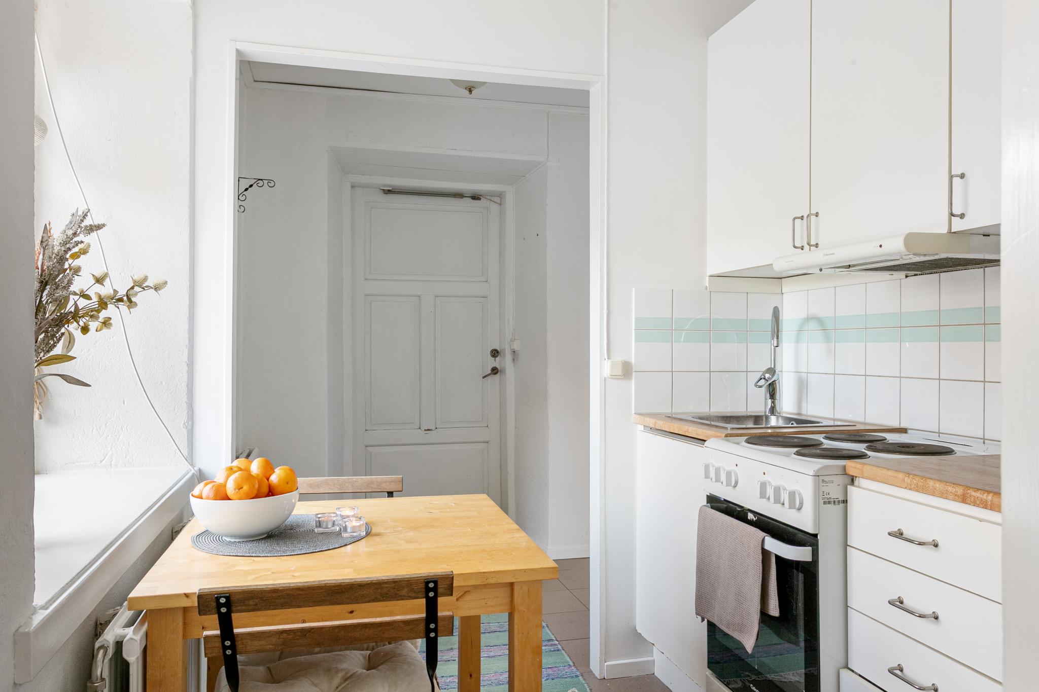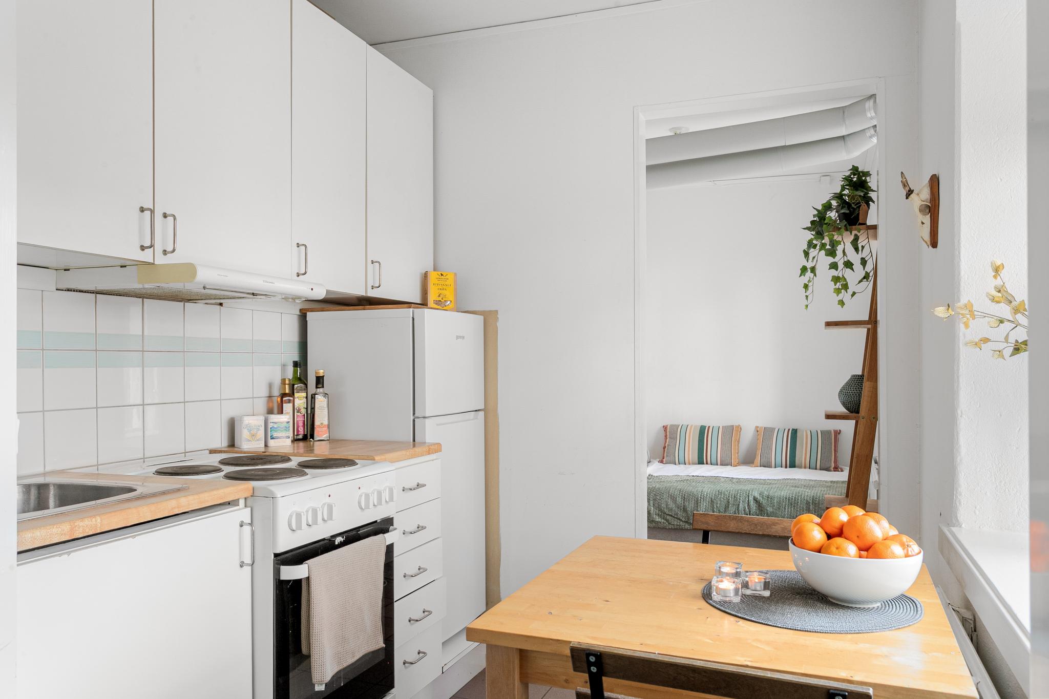 Köket är utrustat med spis med plattor och ugn, fläkt, kylskåp med frysfack samt diskho. Matplats vid fönster.