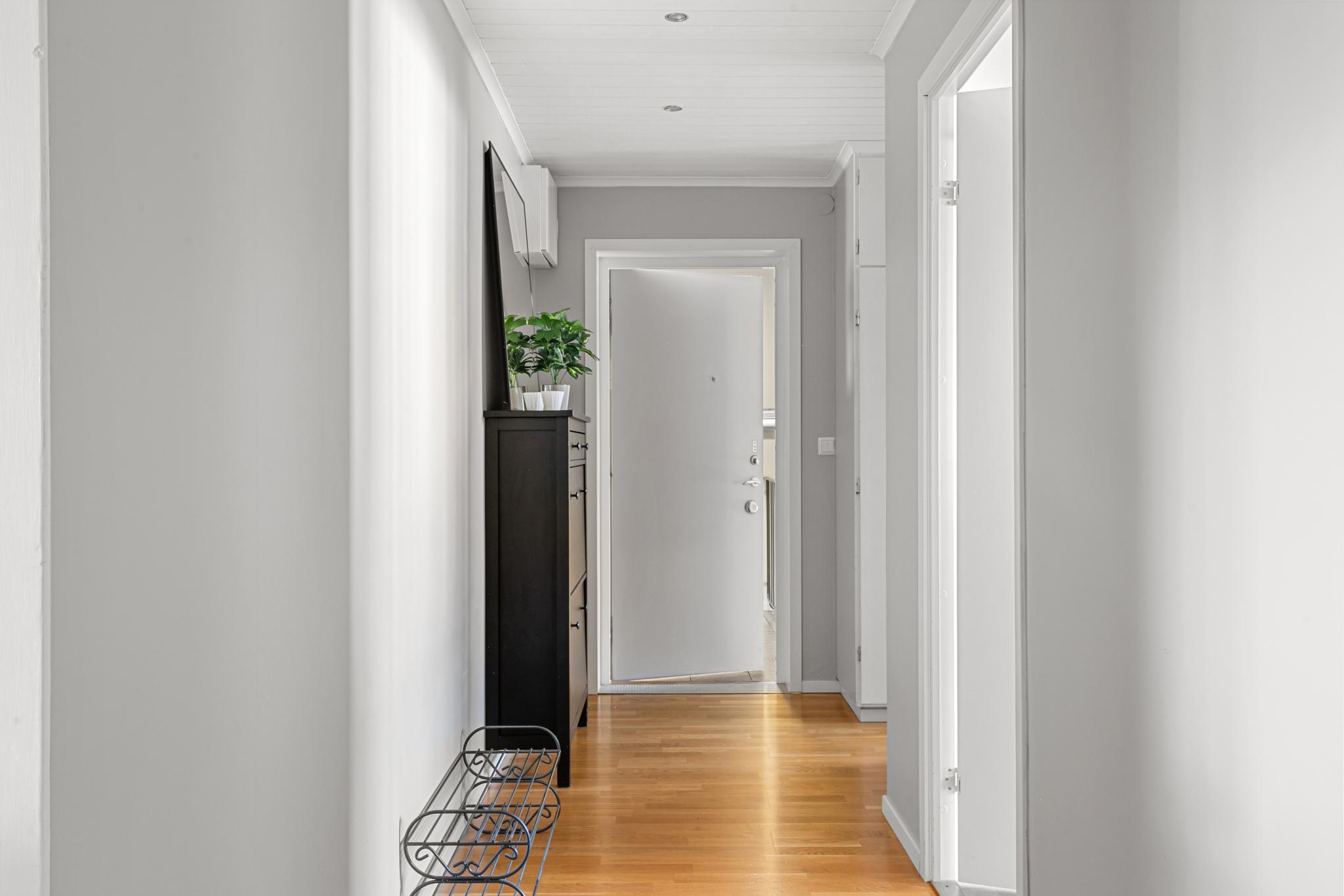 Välkomnande och rymlig hall med plats för ytterkläder och skor. Ekparkettgolv, spotlights i taket och bra förvaringsutrymmen i garderober med överskåp.