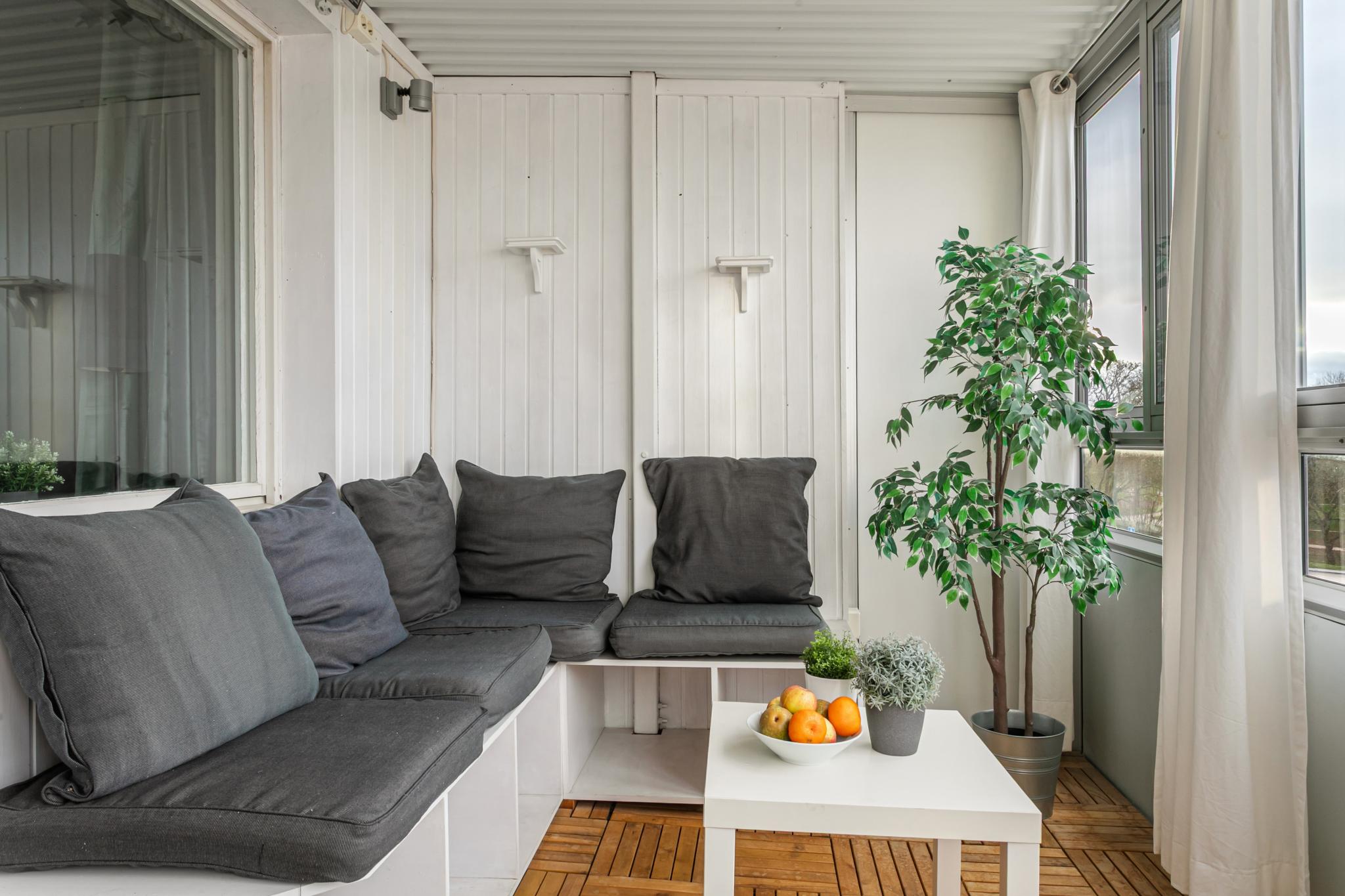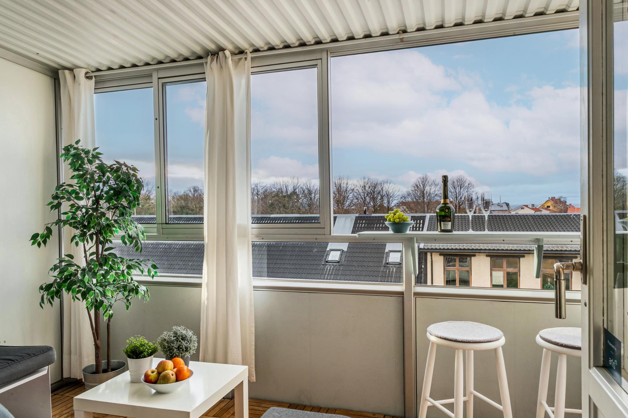 Inglasad balkong i sydväst med platsbyggd soffa och trätrall på golvet. Trevlig vy över hustaken och även en glimt av havet.
