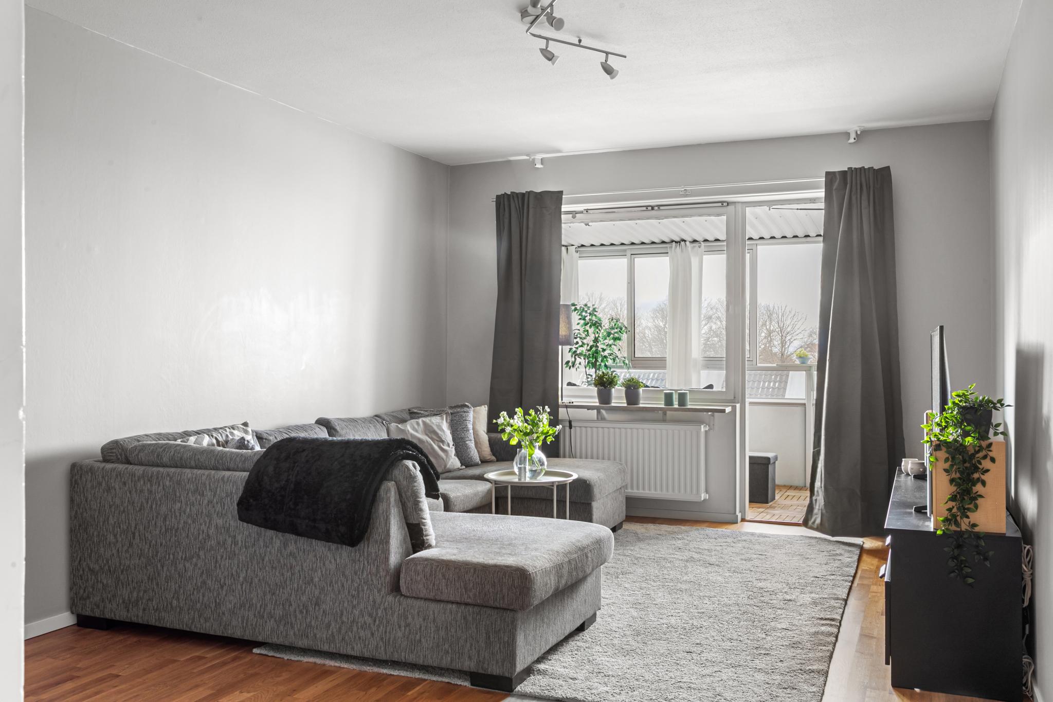 Stort vardagsrum med fönster och utgång till balkongen.