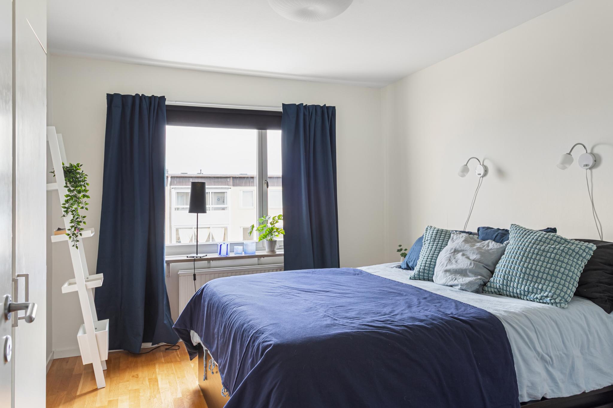 Fint sovrum med tre inbyggda garderober och överskåp. Ekparkettgolv och fönster med vy mot innergården.