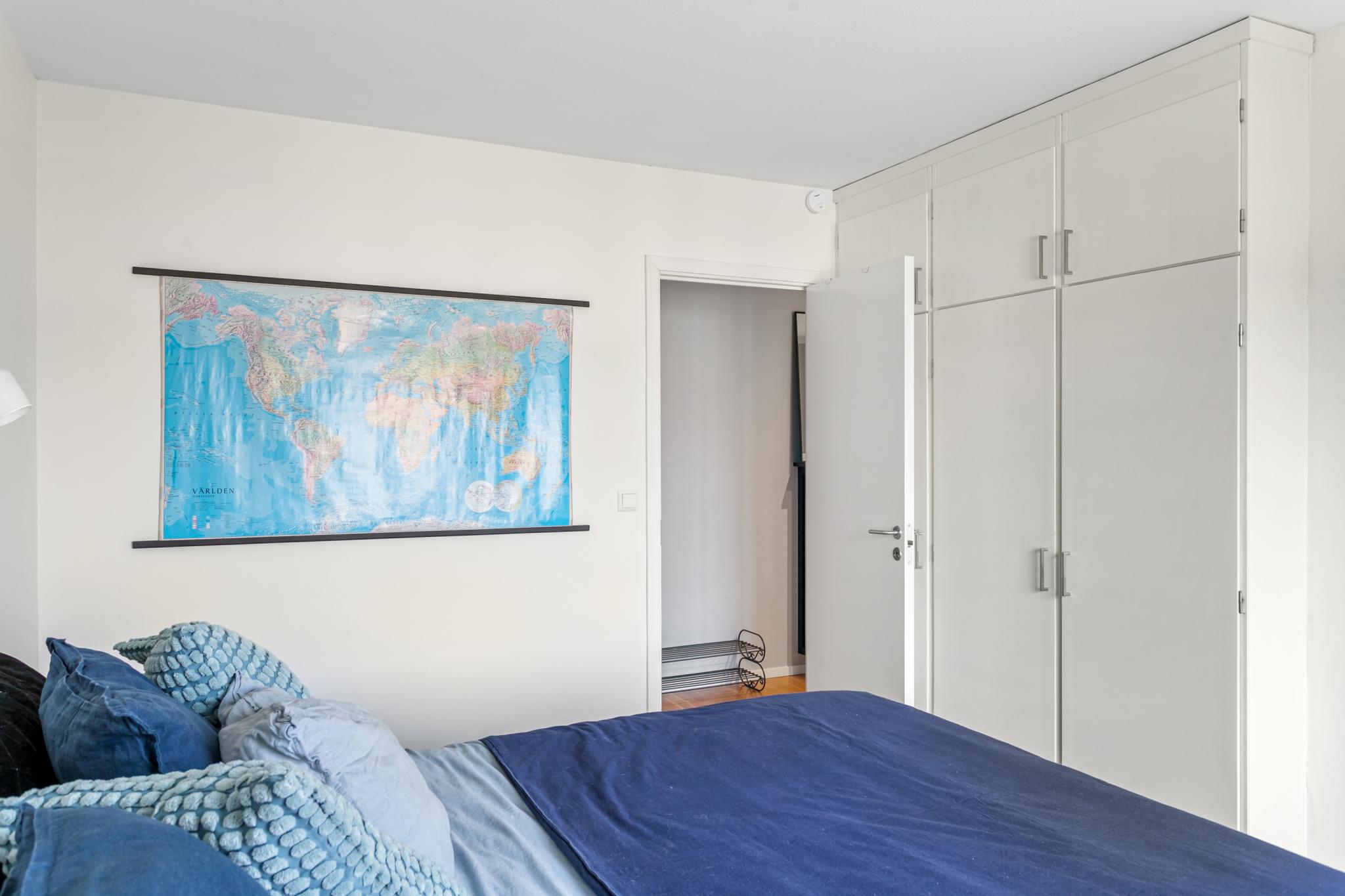 Sovrummet har bra förvaring via tre garderober med överskåp
