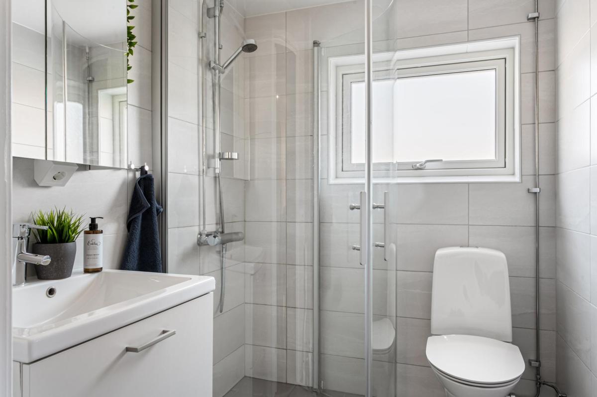 Nytt och helkaklat badrum från 2021 då även stambyte genomfördes. Förberett för tvättmaskin.