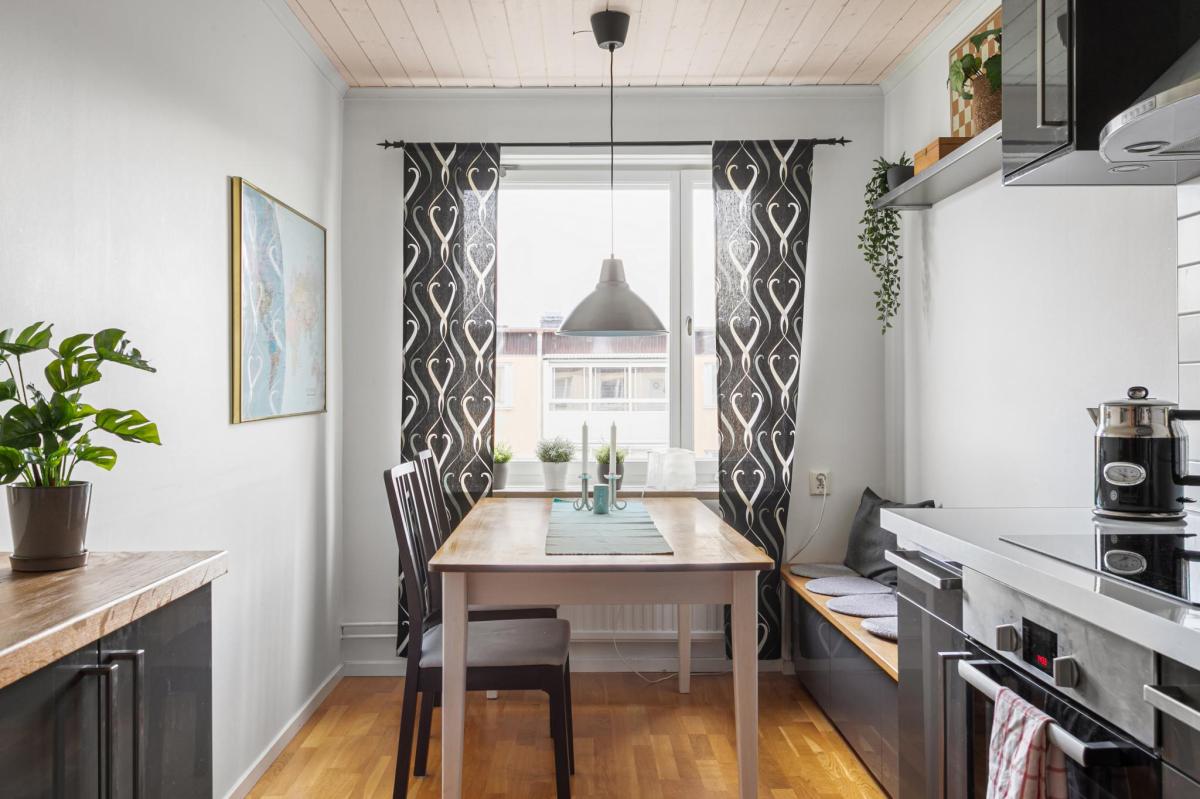 Vackert och trivsamt kök med matplats vid fönster med vy mot föreningens innergård. Platsbyggd soffa med förvaring. Köket har inbyggd mikro, induktionshäll, ugn, diskmaskin och kombinerat kyl/frysskåp. Vitmålad träpanel i taket, där även spotlights och högtalare byggts in.