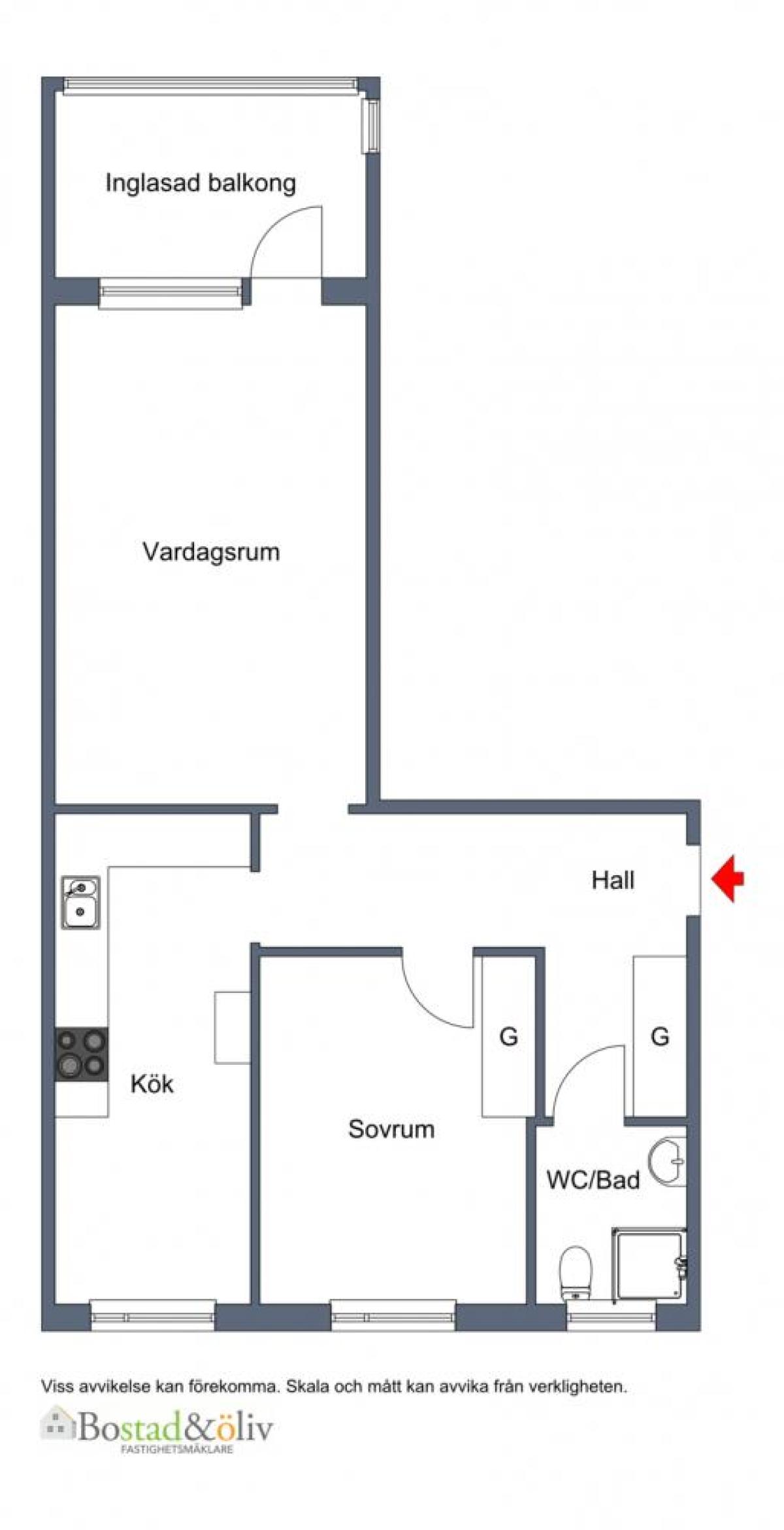 Samtliga areauppgifter är hämtade från bostadsrättsföreningen eller baserade på säljarens information. Dessa uppgifter kan av olika anledningar vara fel. Den köpare som tycker att arean har betydelse för köpet bör därför vidta en uppmätning.