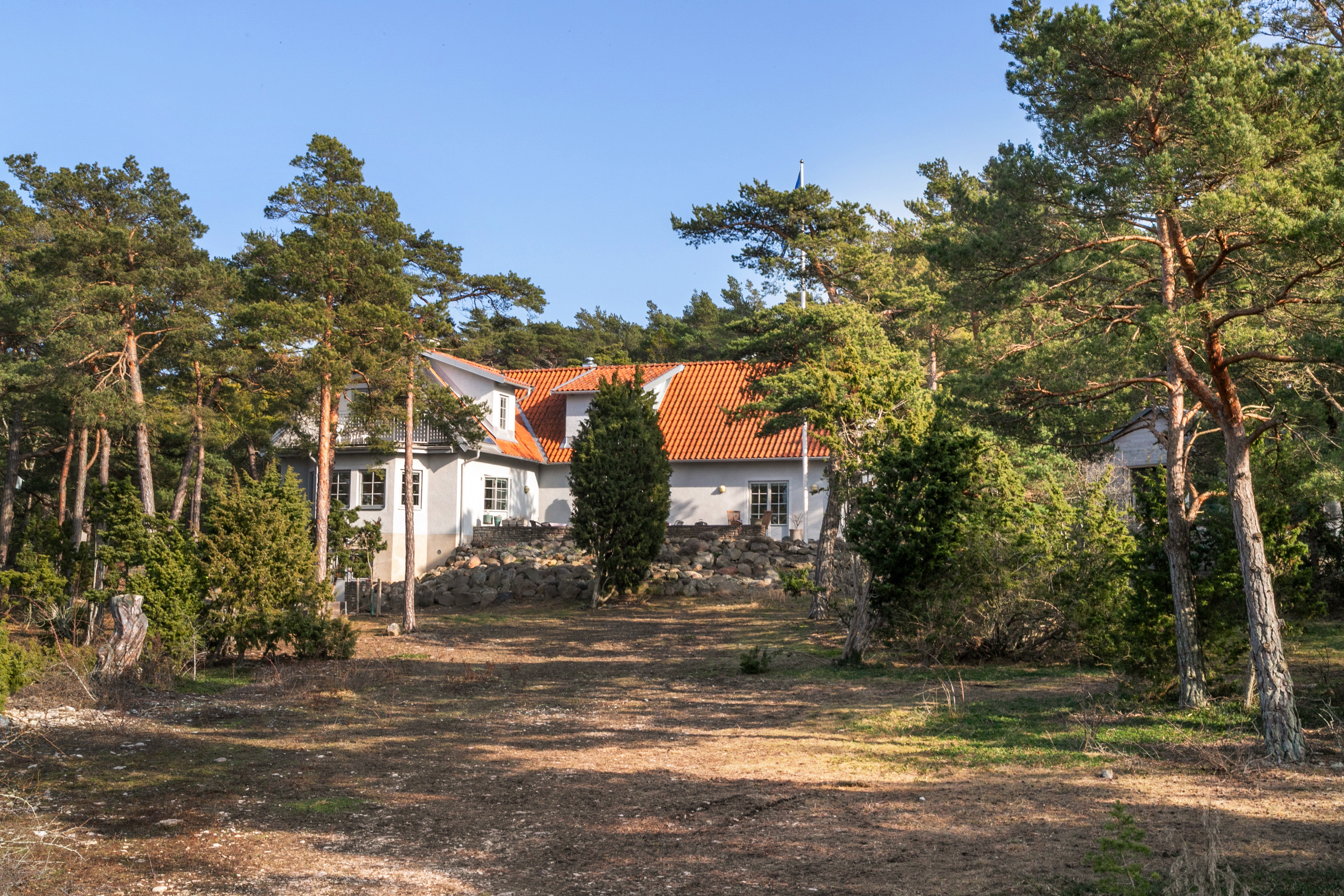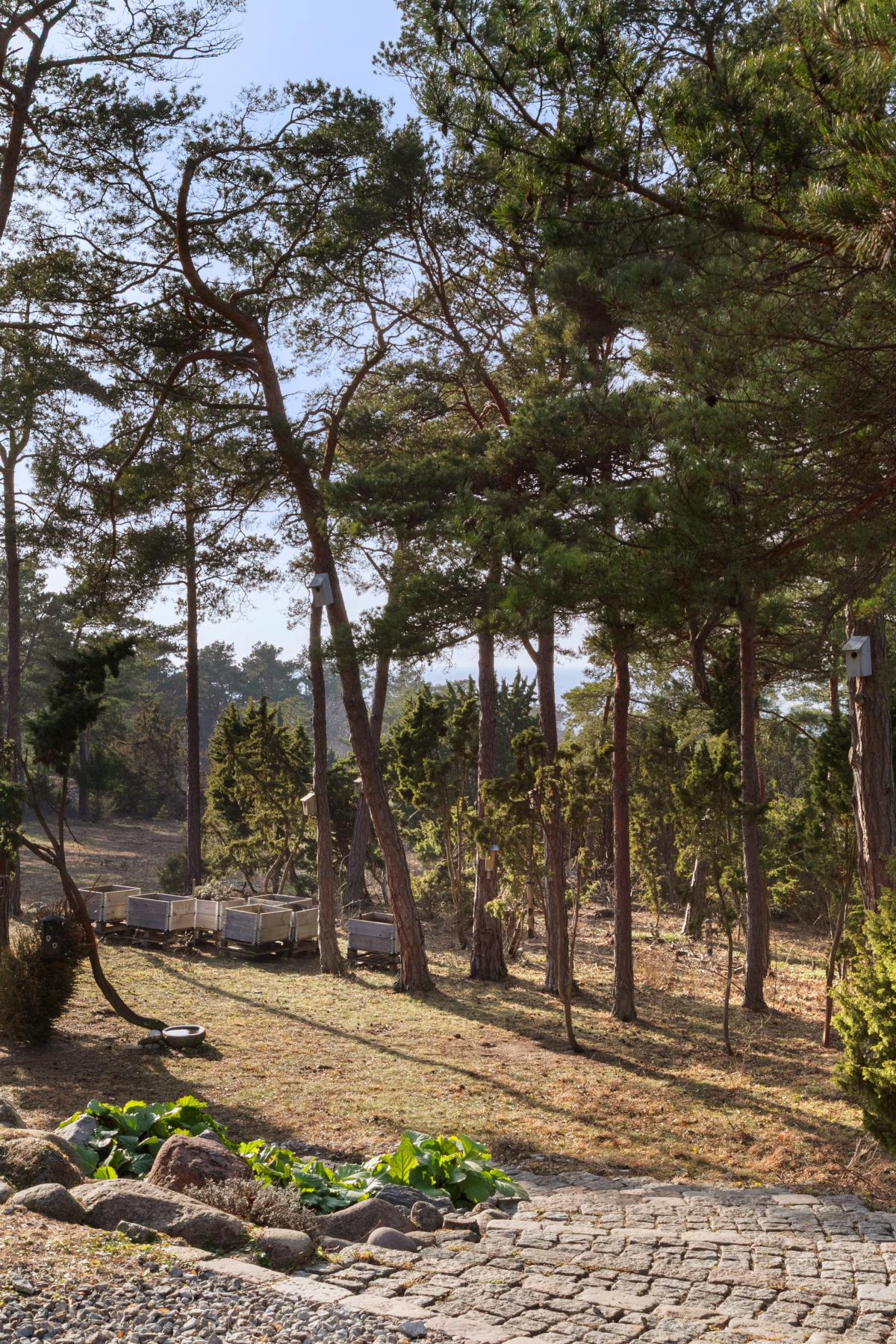 Lättskött naturtomt med naturliga nivåskillnader som innebär att byggnaderna och uteplatserna har en öppen och fri sikt ner mot havet. Uppvuxna träd och vackert stenparti med planteringar framför uteplatsen.