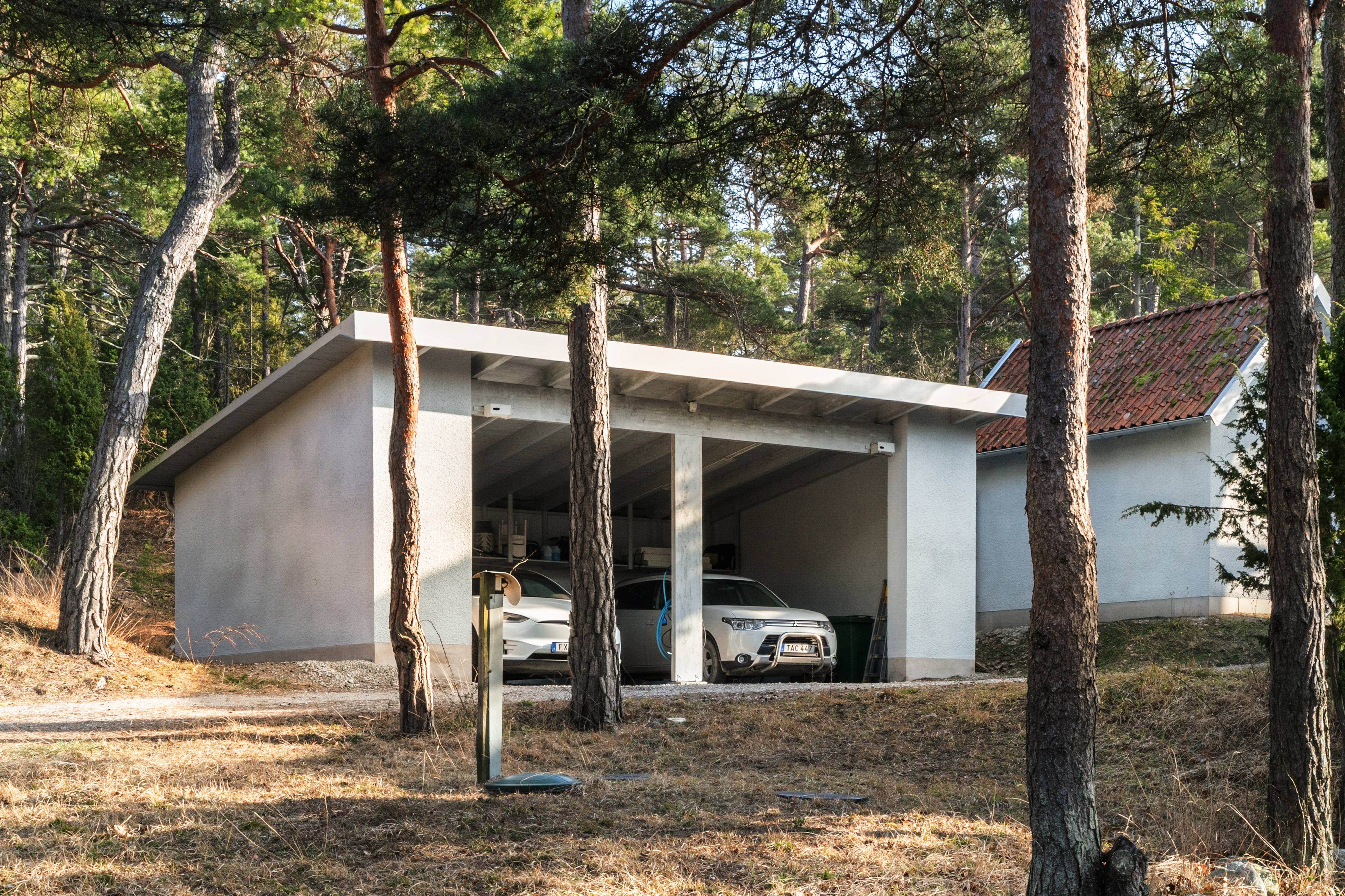 Carport med plats för två bilar. Laddare för elbil finns.