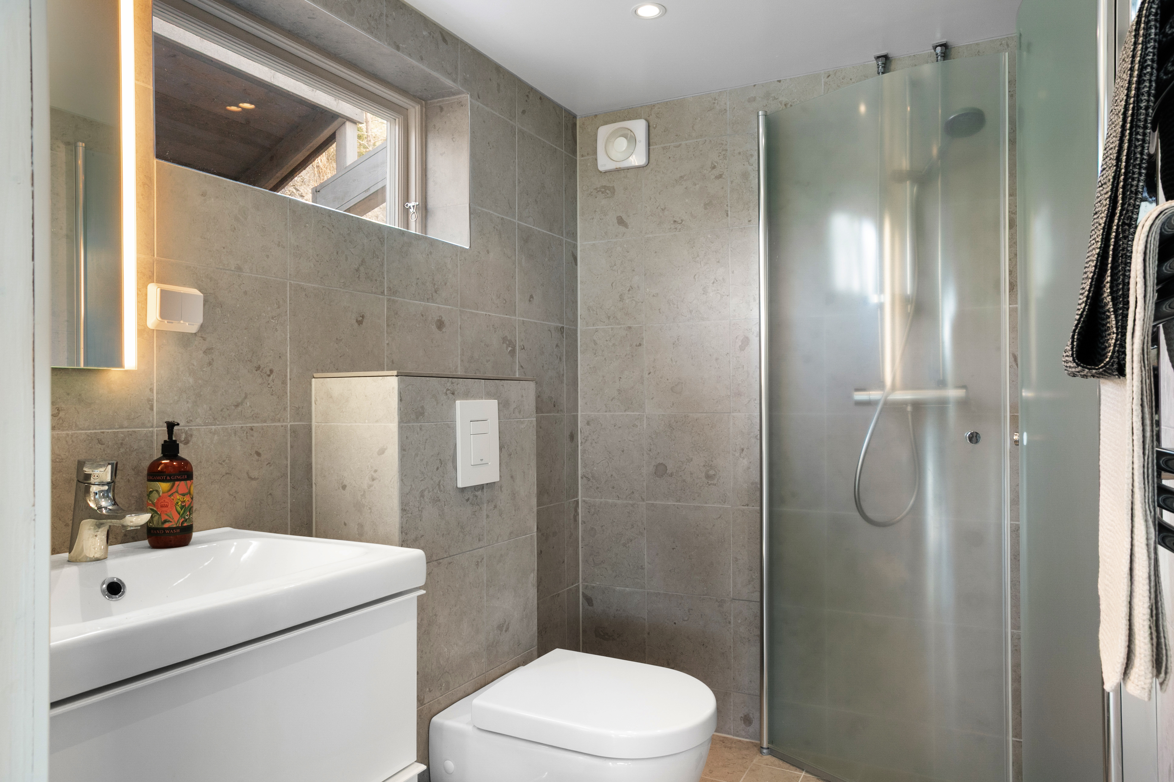 Helkaklat badrum med golvvärme, dusch och wc. Stort handfat och bra förvaring.