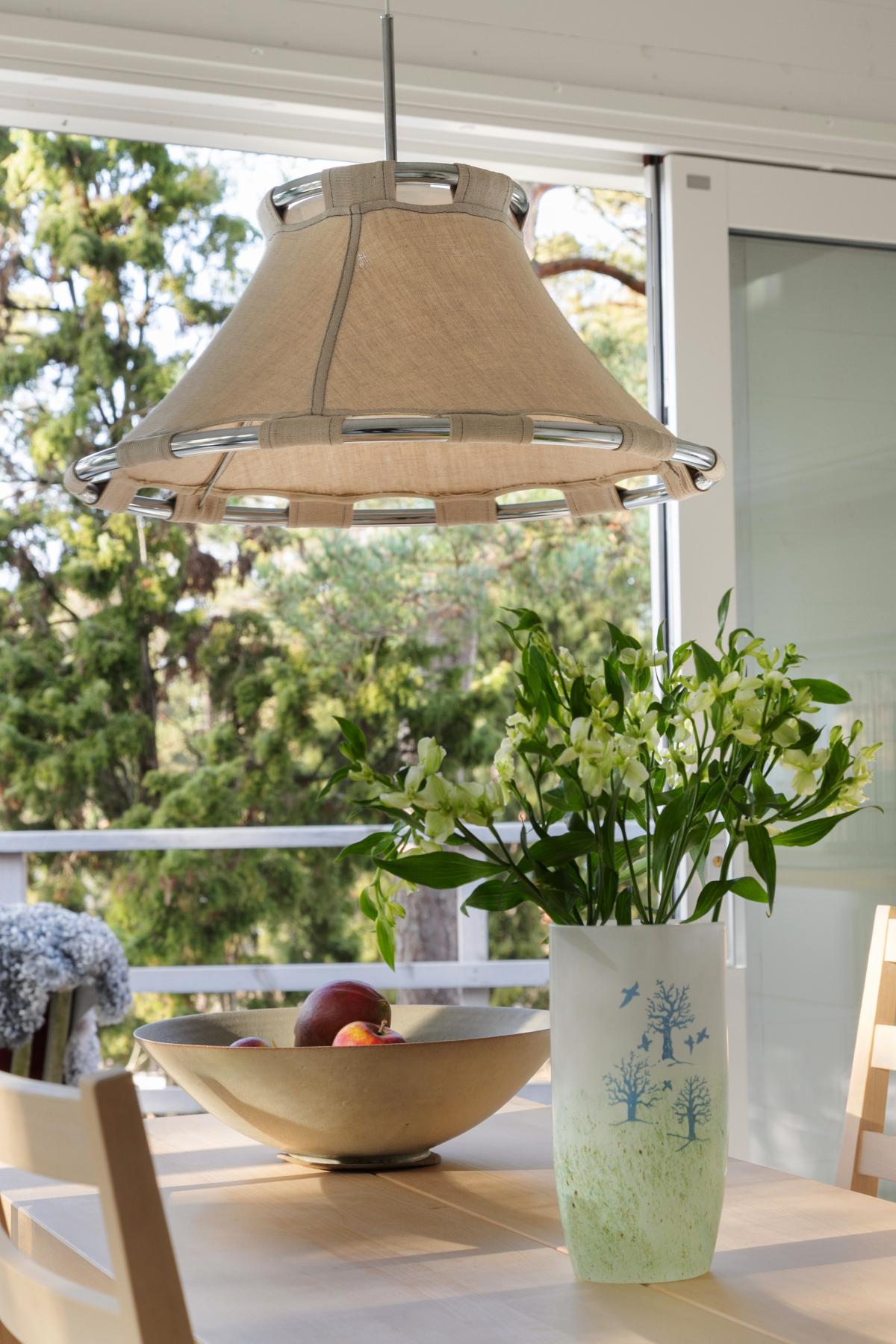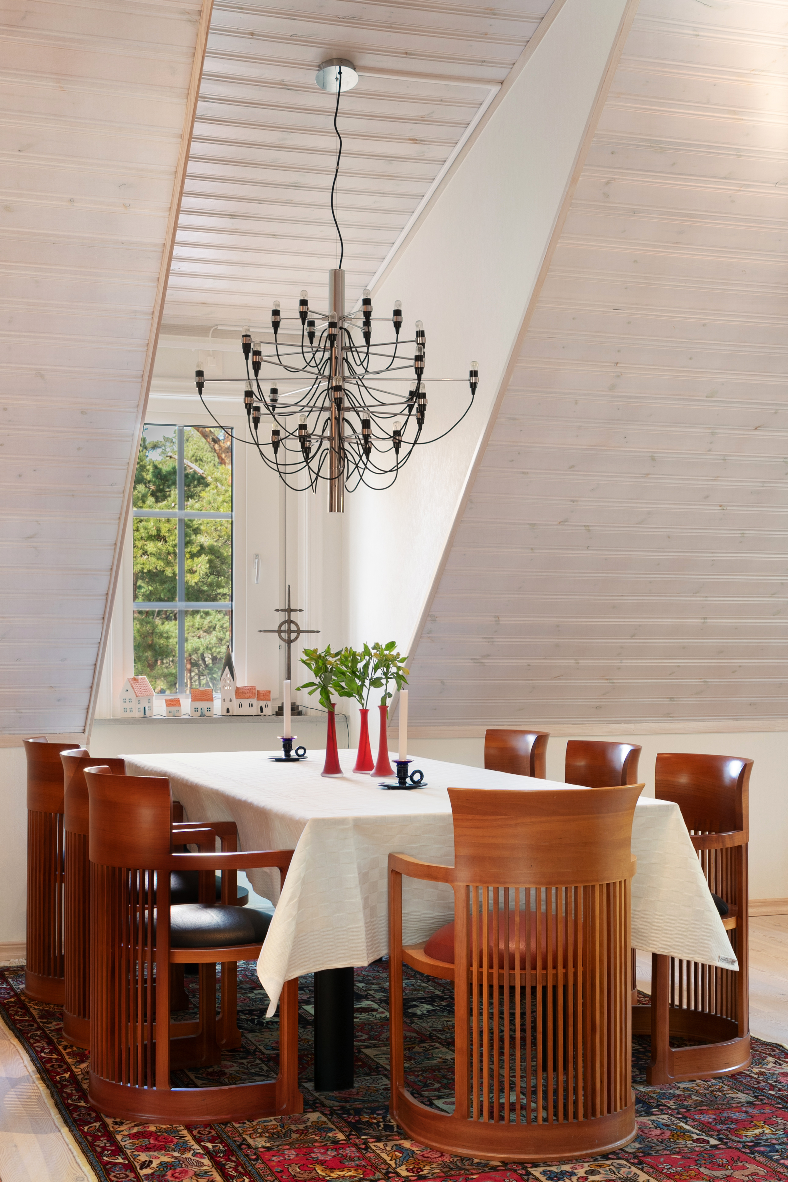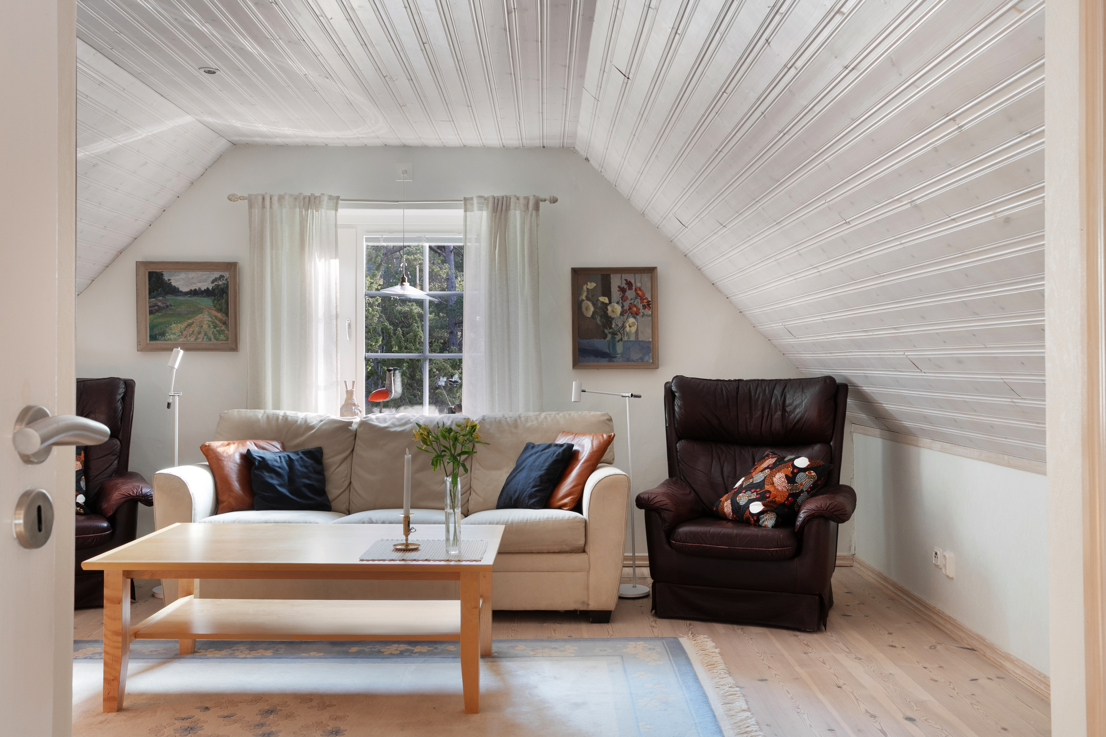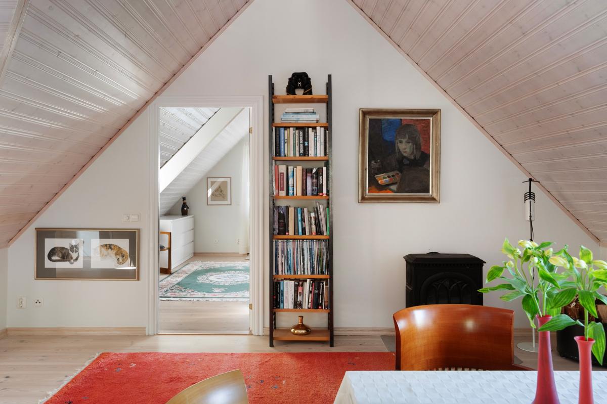 Direkt uppe på övervåningen har du husets andra allrum. Rummet är för närvarande möblerat med en matsalsmöbel men kan även med fördel användas som tv-rum eller för umgänge. Rummet har bra ljusinsläpp och här finns också en järnspis av modell Jötul F3.