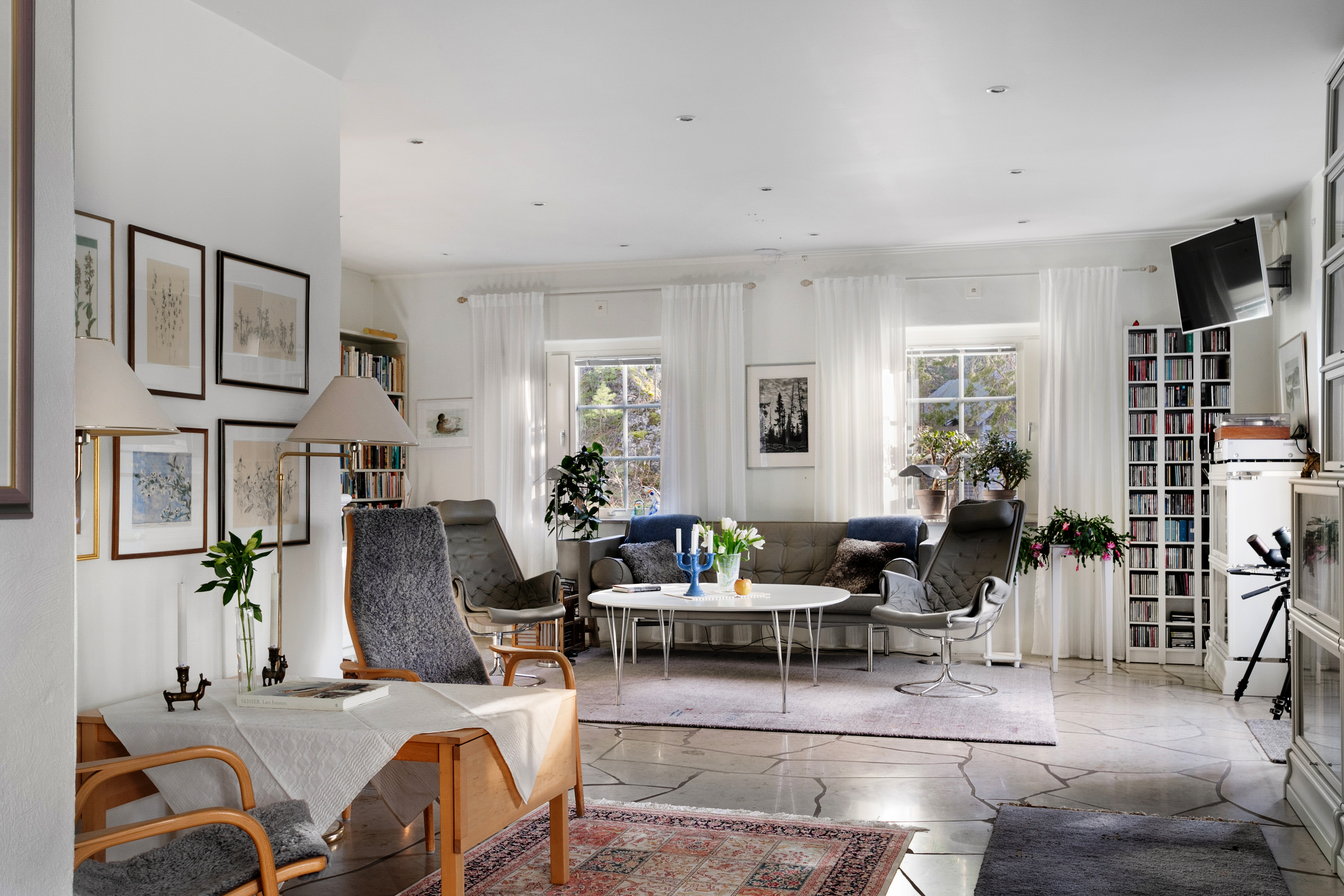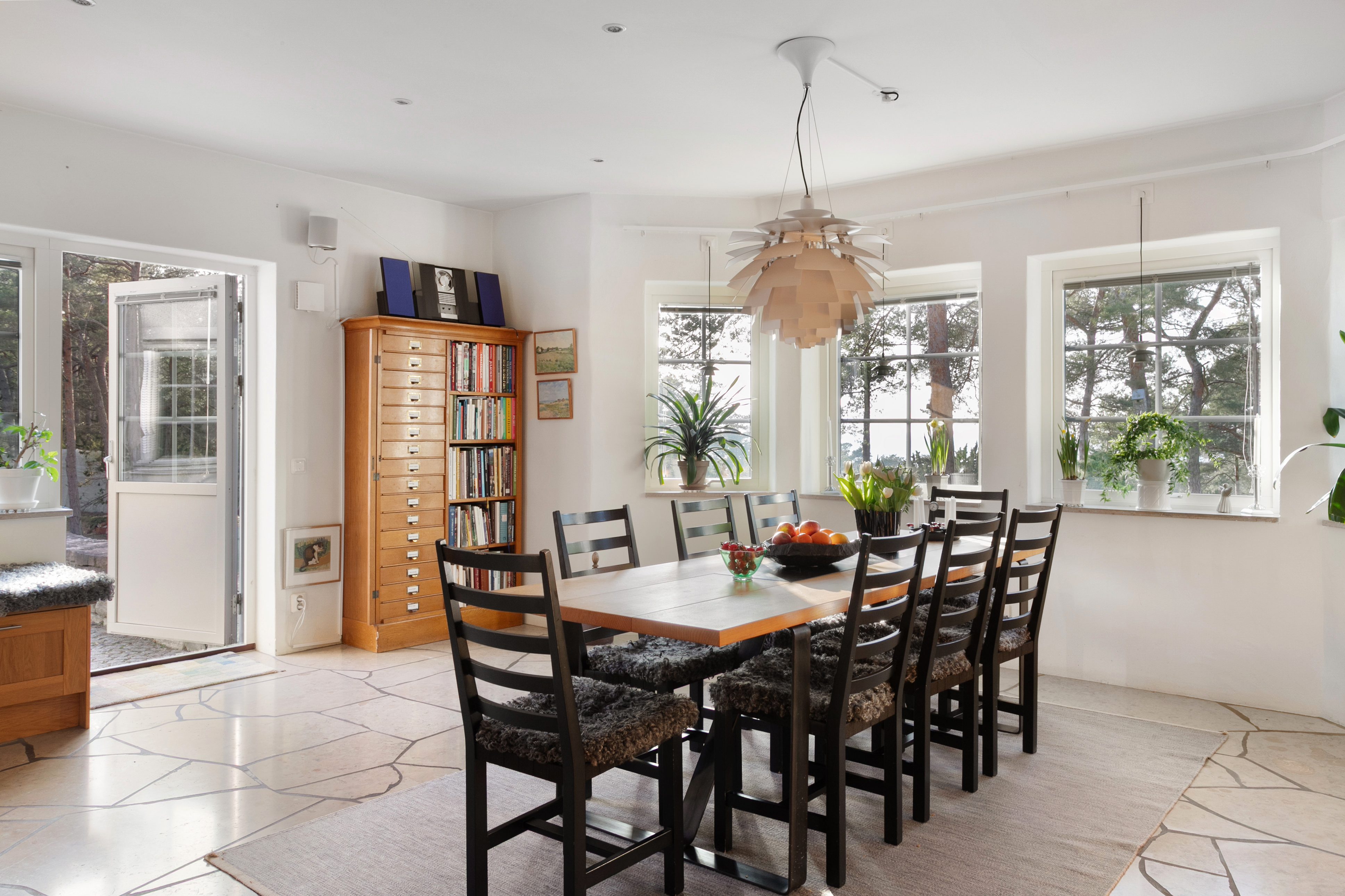 Stort härligt allrum med kakelugn, modell Cronspis, finns centralt placerad i rummet. Med fönster mot söder och dubbla balkongdörrar mot havet i väst har du här ett rum med både utsikt och fint ljusinsläpp. Allrummet har plats för både soffgrupp och behaglig läsplats.
