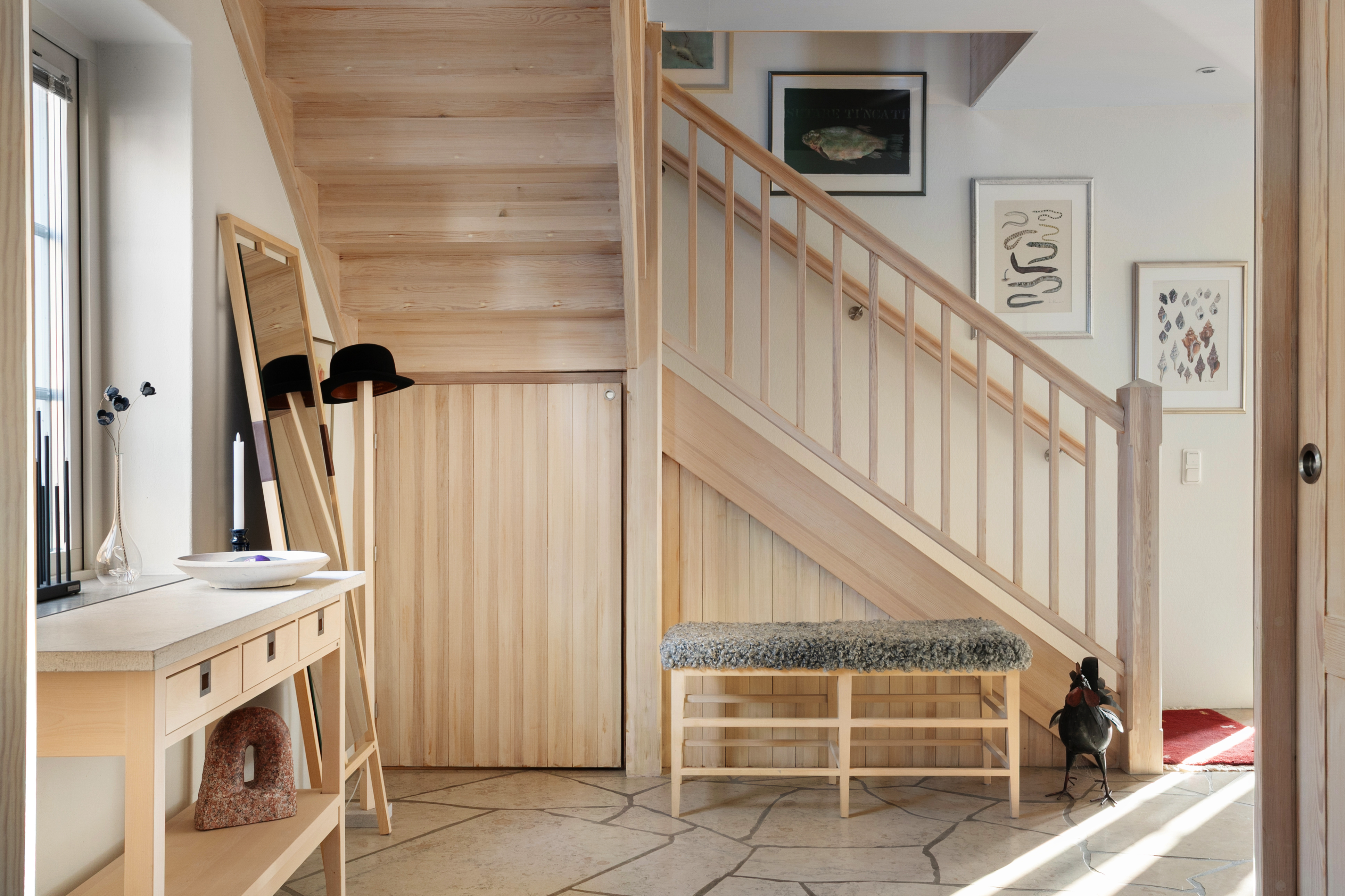 hela entréplan har kalkstensgolv - här med kompass i hallen