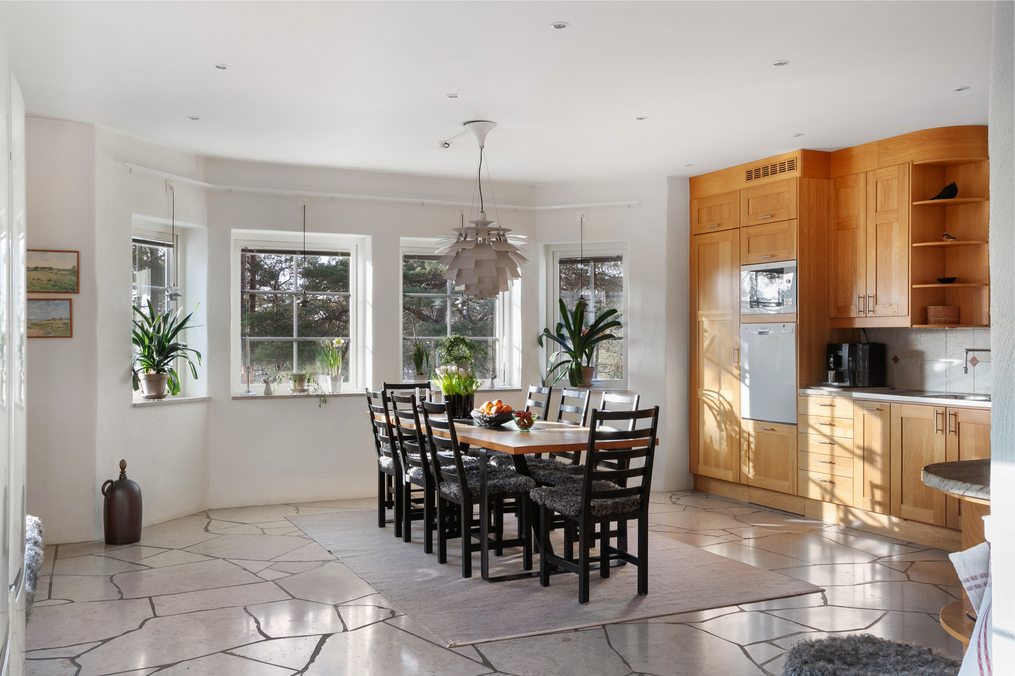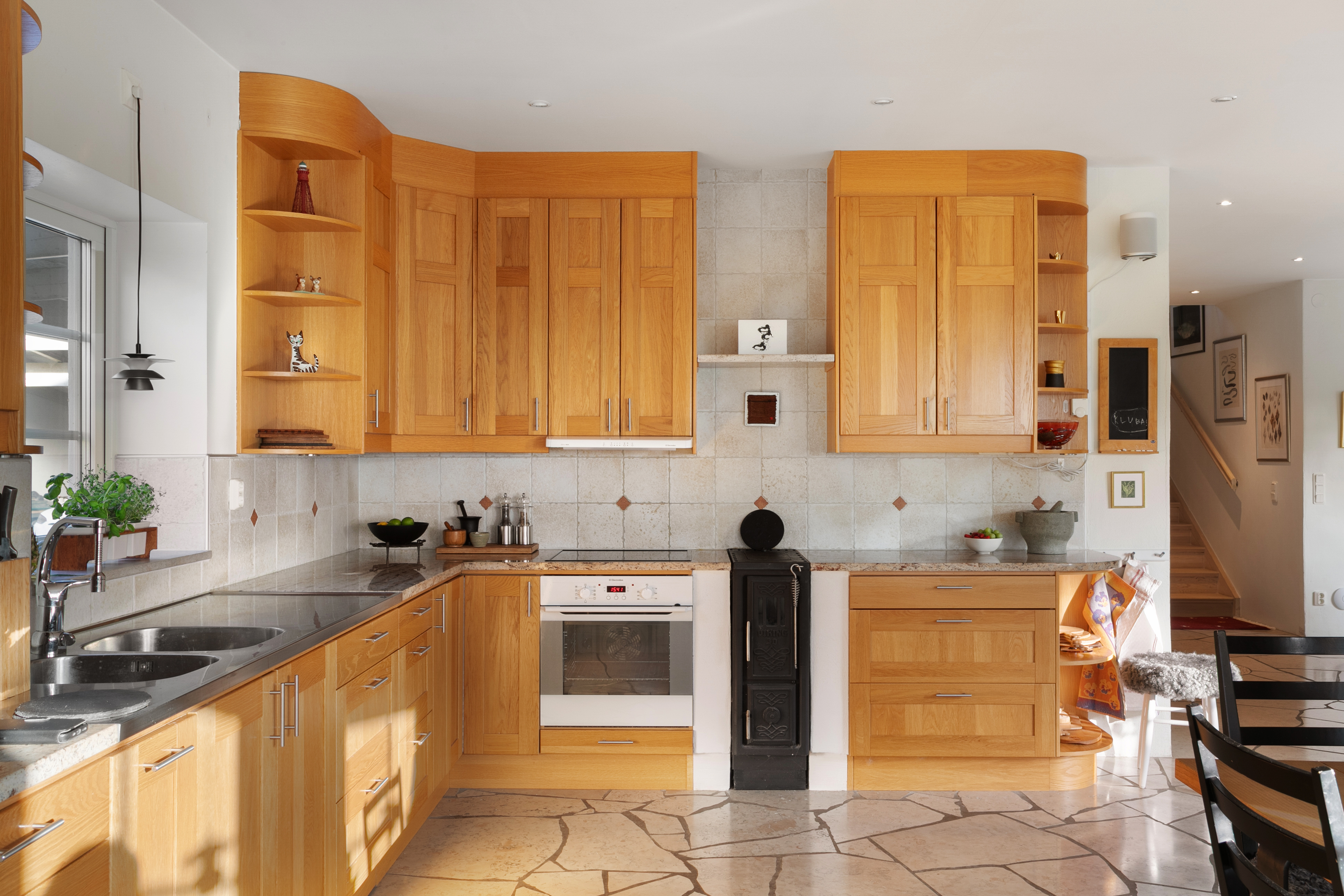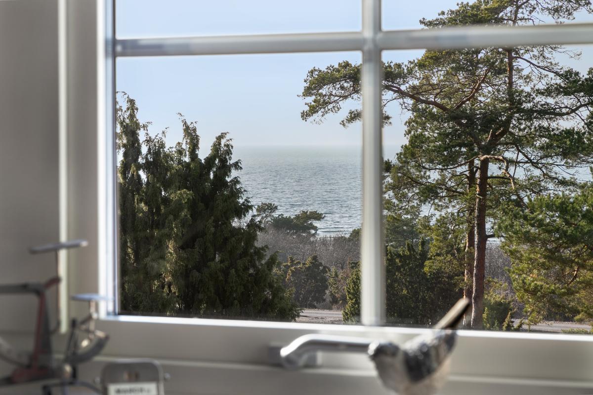 Välplanerat och smakfullt kök från Ballingslöv med goda utrymmen i lådor och skåp av Ölandsek. Kombinerad kyl-sval samt frys i fullhöjd, inbyggd micro och diskmaskin i bra höjd. Spishäll och en fungerande vedspis för både värme och trivsel. Köket har samma fina kalkstensgolv som i hall och allrum. Härligt ljusinsläpp genom fönster i tre väderstreck samt utgång till den stensatta uteplatsen. Matplats med havsutsikt och bra utrymme för familj och gäster.