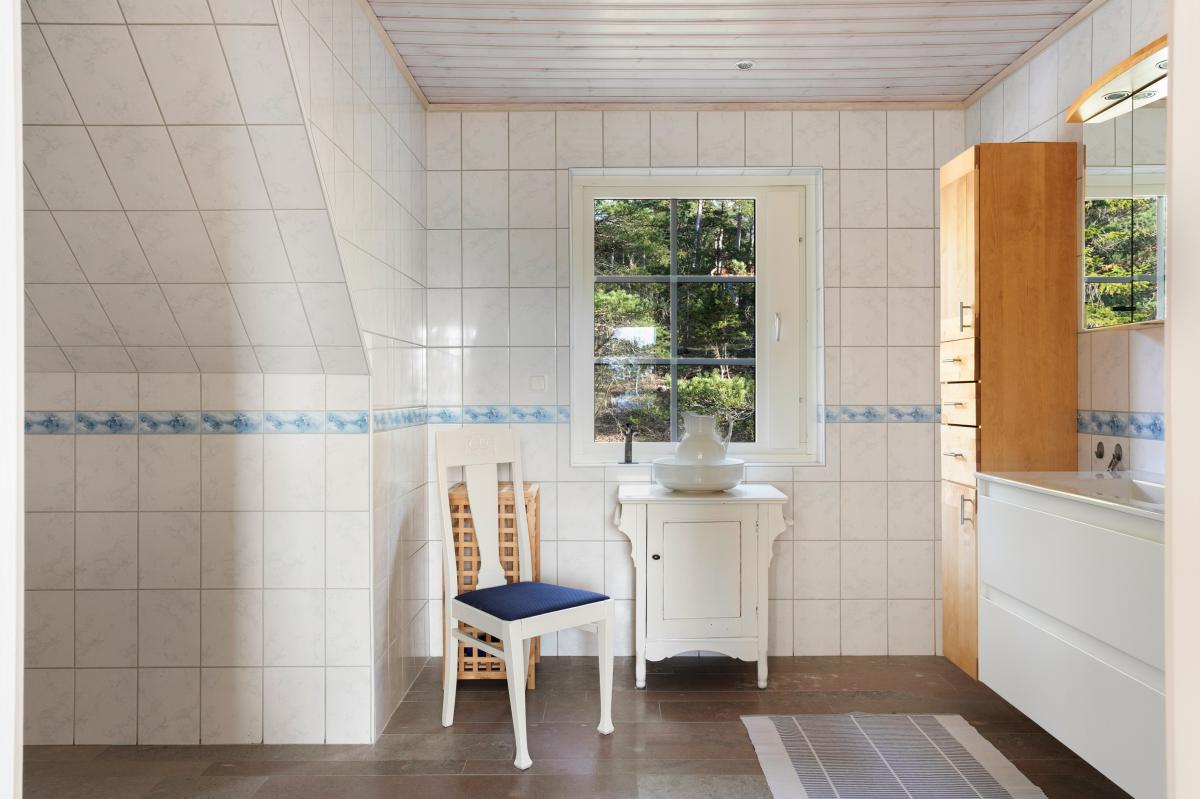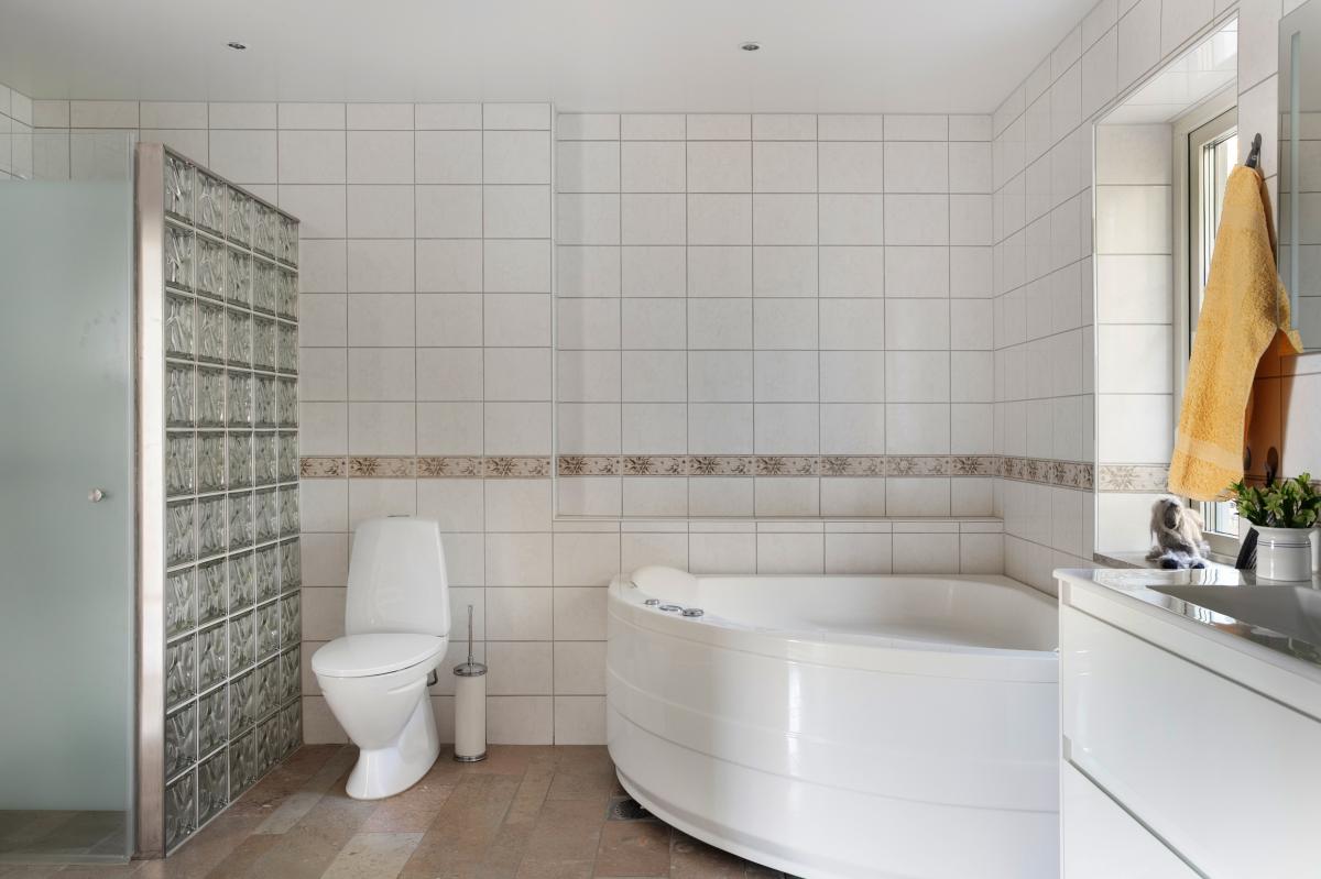 Stort generöst och helkaklat badrum med bubbelbadkar, separat duschutrymme samt vedeldad bastu. Badrummet har ett stort handfat med tvättkommod, handdukstork, skåp, tvättmaskin samt bänkskiva.