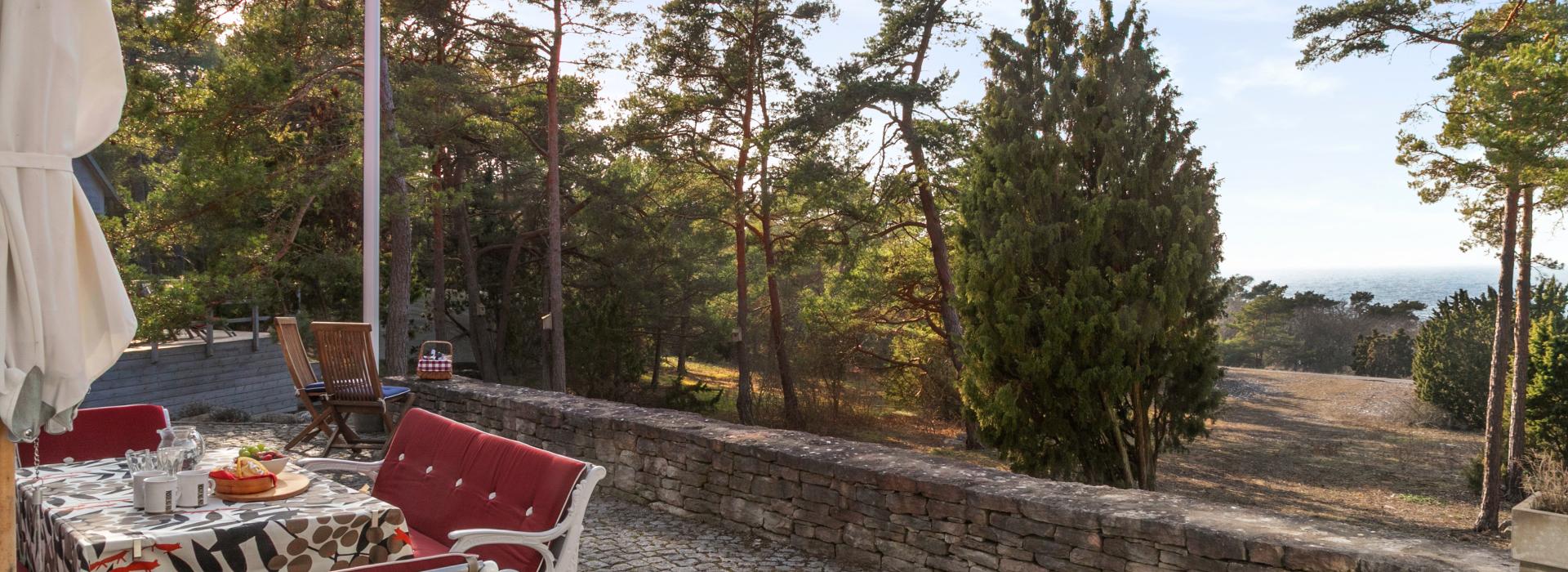 I husets vinkel med utgång från både kök och allrum finns en fint stensatt uteplats med härlig vy mot havet i väst. En vacker stenmur och en trevligt anlagd rabatt i det stora stenpartiet nedanför huset förgyller uteplatsen.
