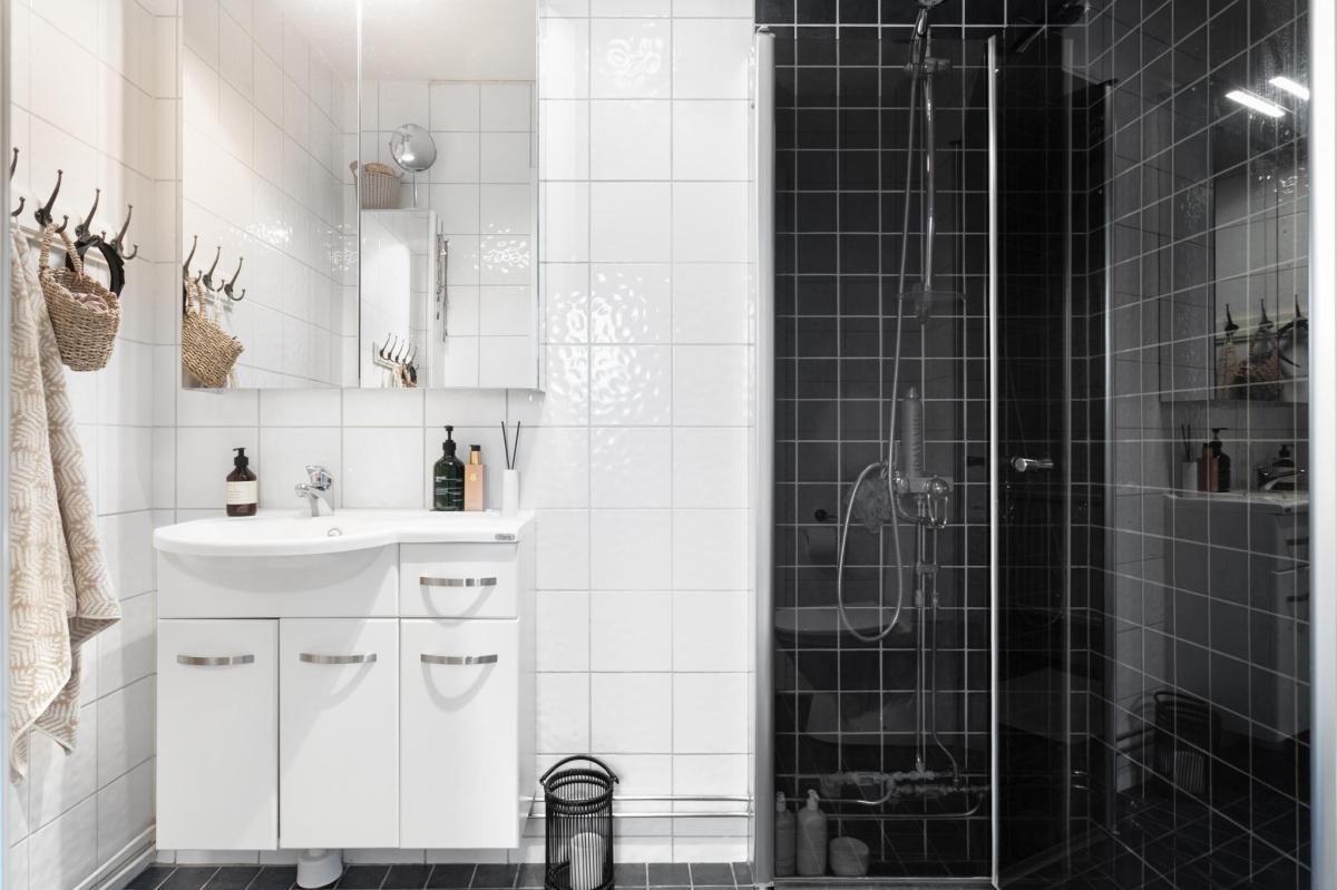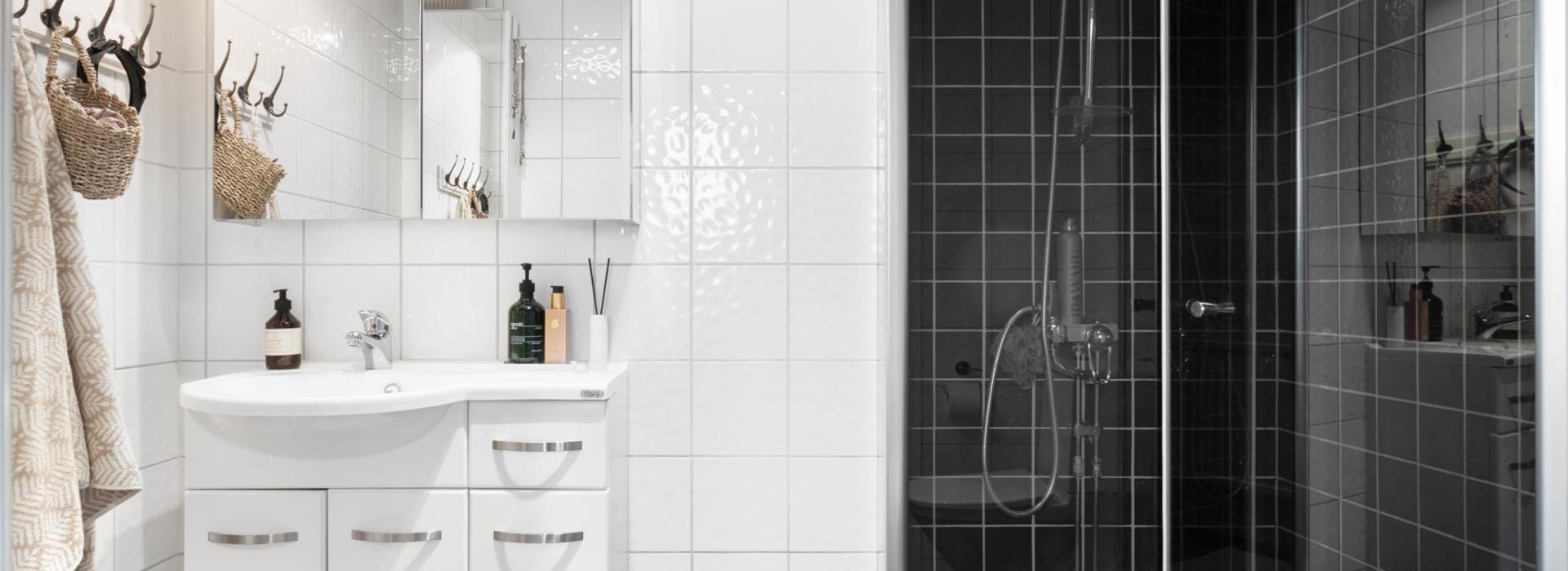 Fräscht badrum med helkaklade väggar i vitt och svart och mörkt klinkergolv.