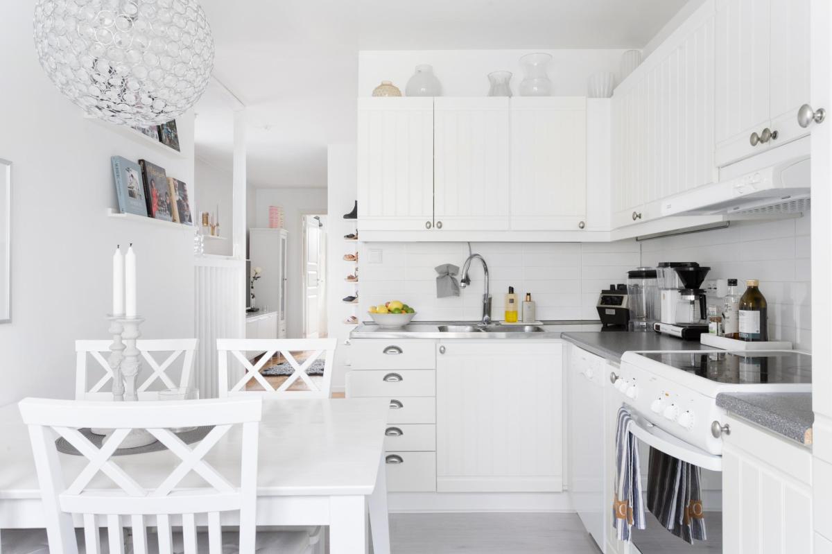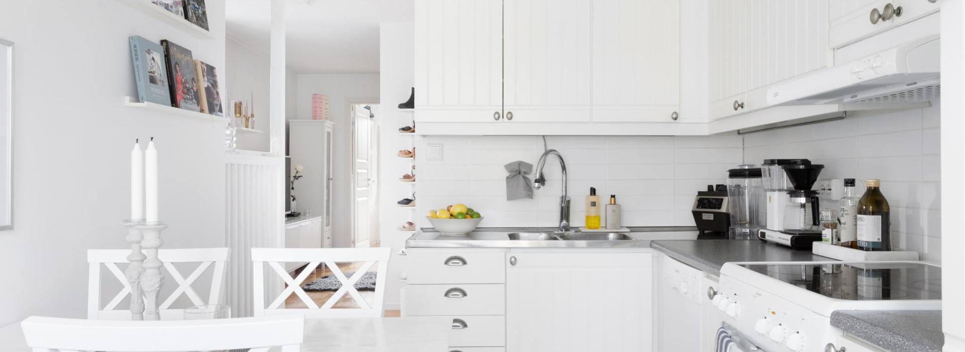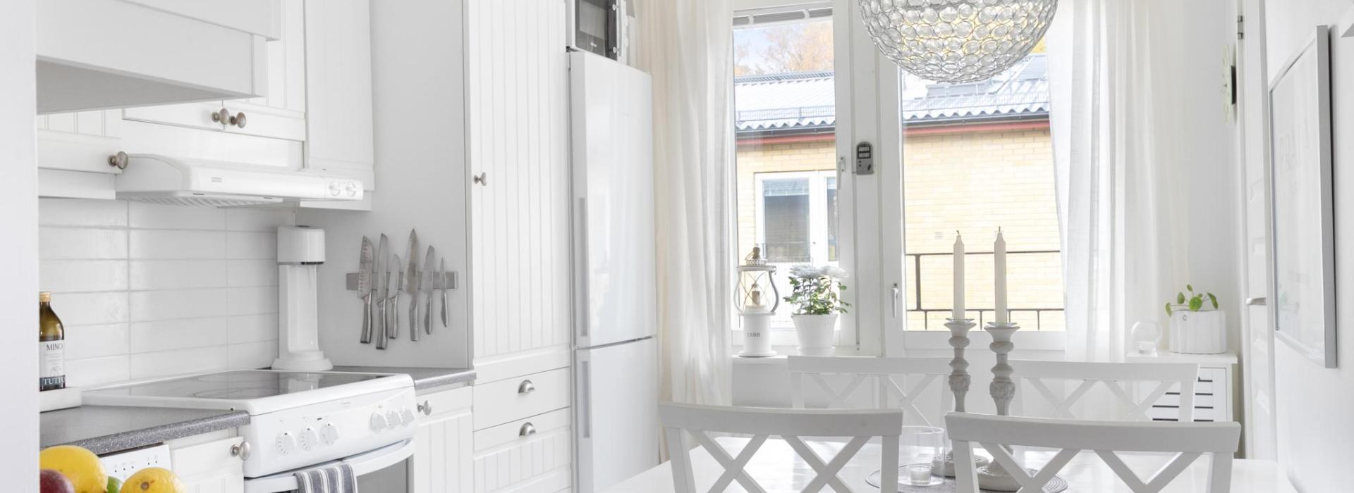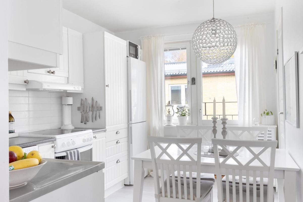 Ljust och trivsamt kök med plats för matbord. Köket är väldisponerat och stilrent med vita skåpluckor, gråa bänkskivor och vitt kakel. Fönster och fransk balkong i öster. Ljust laminatgolv.