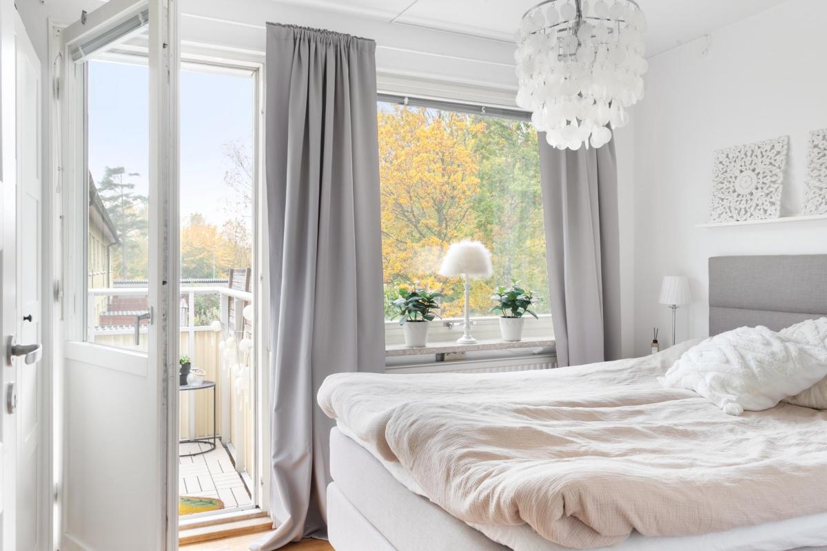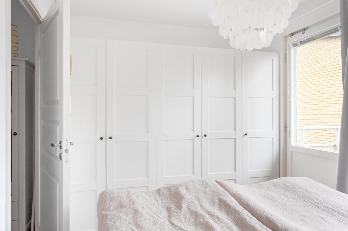 Fint sovrum med stort fönster och balkong mot föreningens grönområde. Rummet har en garderob och två dubbelgarderober från 2025. Ekparkettgolv.