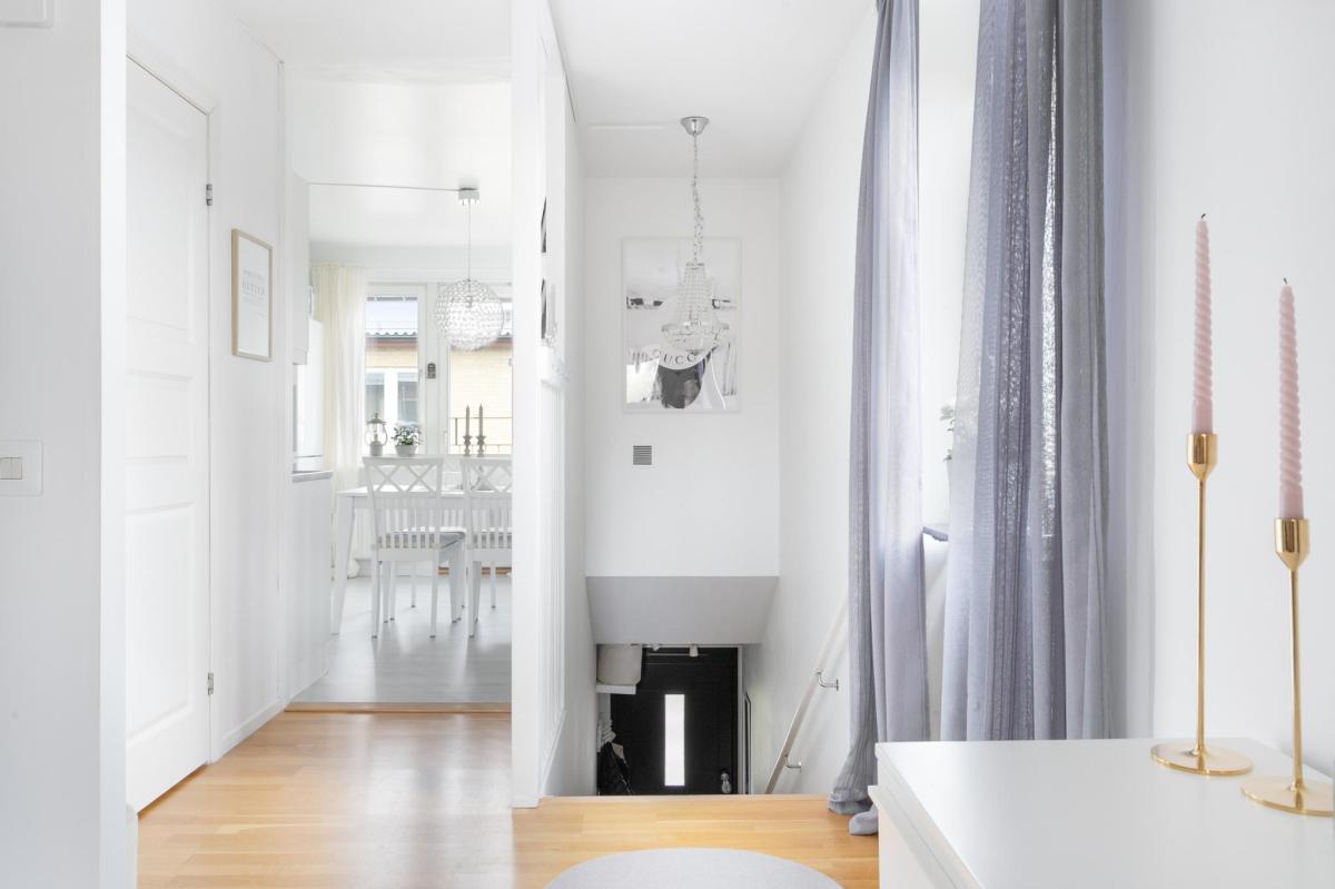 Entré med plats för ytterkläder och skor. Ekparkettgolv. Fin trappa upp till hall på övre plan. Hallen har fint ljusinsläpp från fönster i söder. Ekparkettgolv.