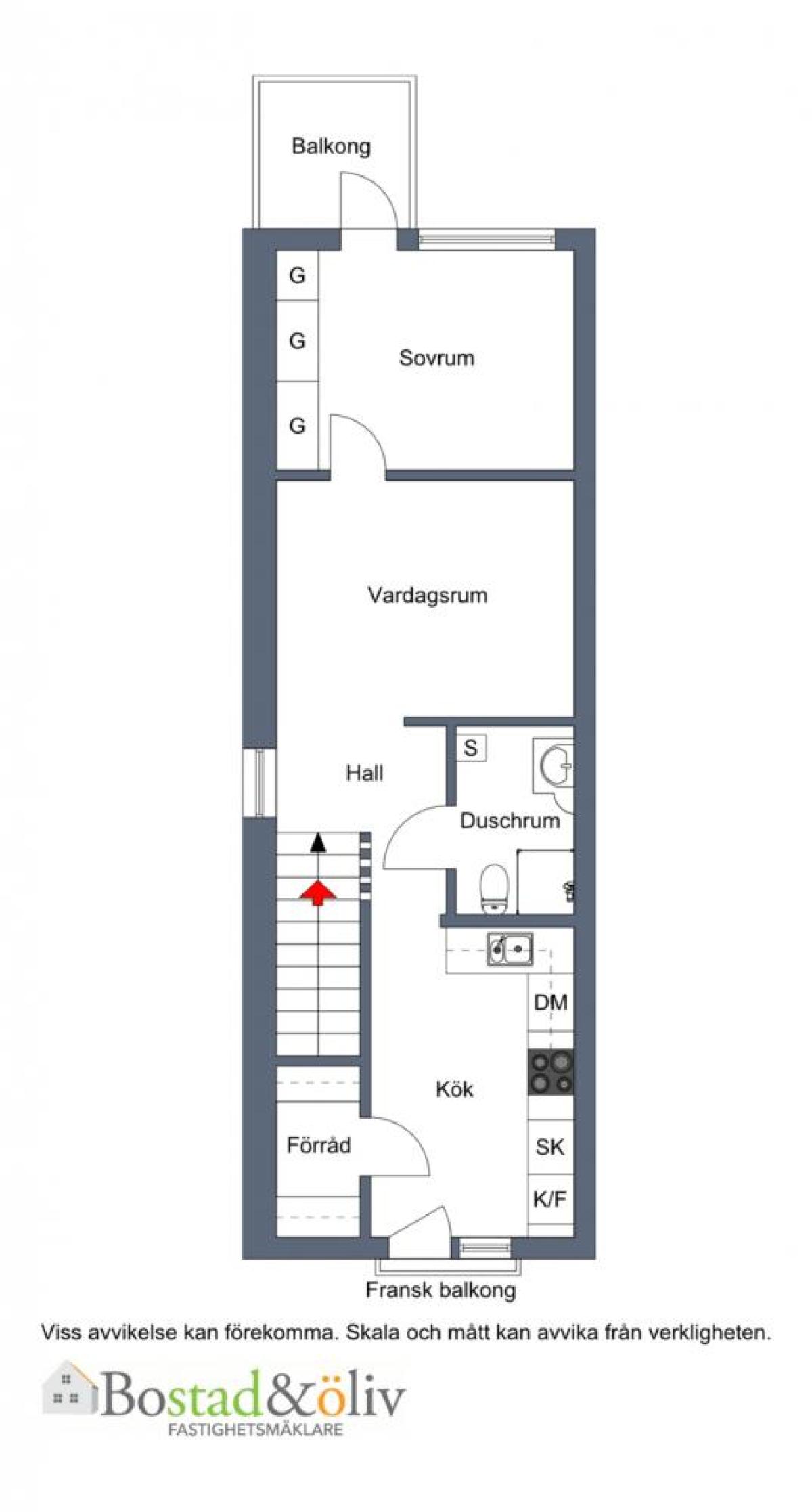 Samtliga areauppgifter är hämtade från bostadsrättsföreningen eller baserade på säljarens information. Dessa uppgifter kan av olika anledningar vara fel. Den köpare som tycker att arean har betydelse för köpet bör därför vidta en uppmätning.